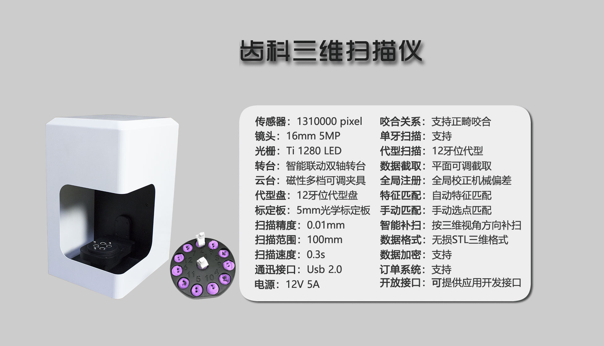 1、全自動掃描 ,省時省力:全自動進行掃描,操作簡單方便,只需一個按鍵就可輕松獲取數(shù)據(jù),省時省力。2、高精度,滿足多種專業(yè)領域的數(shù)據(jù)要求:拍照式測量的方式,提供高精度、高質量的標準STL數(shù)據(jù),精度小于